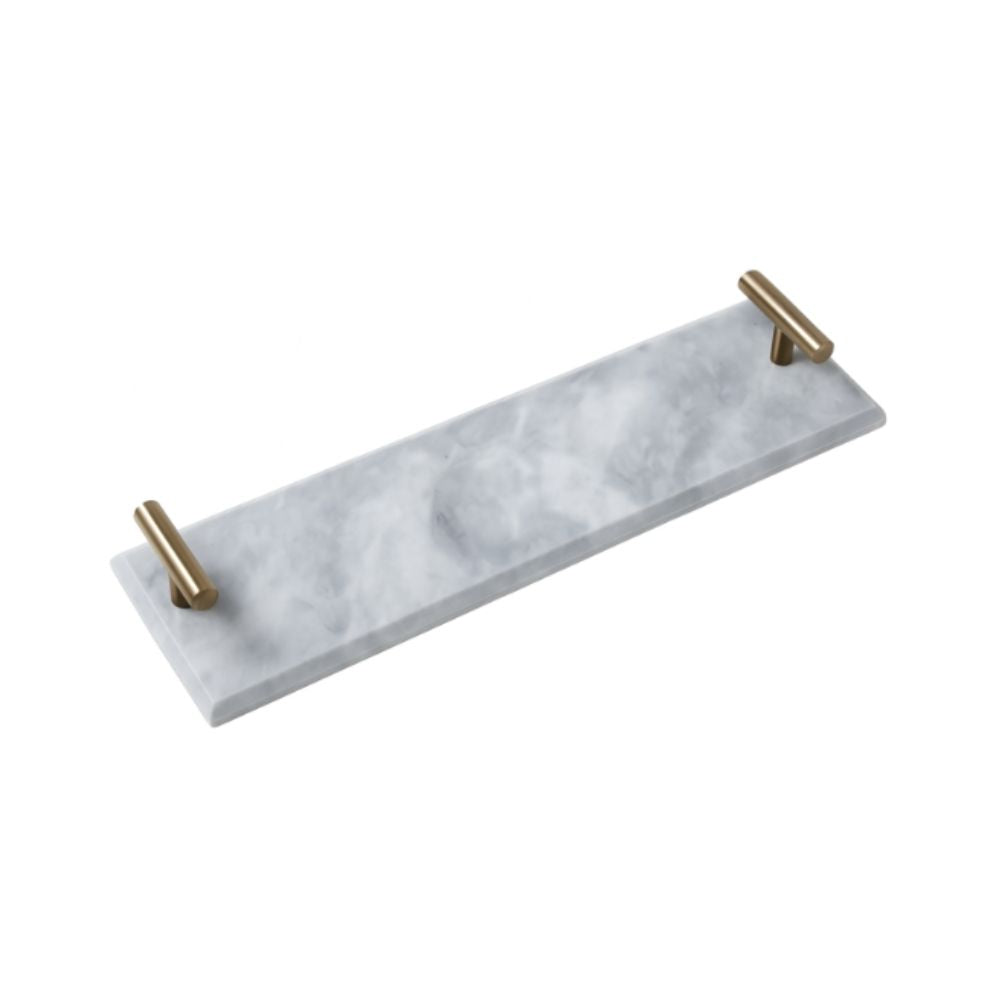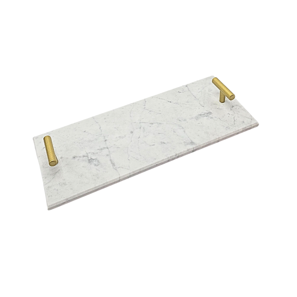 Bandeja em mármore branco com pegadores em metal dourado