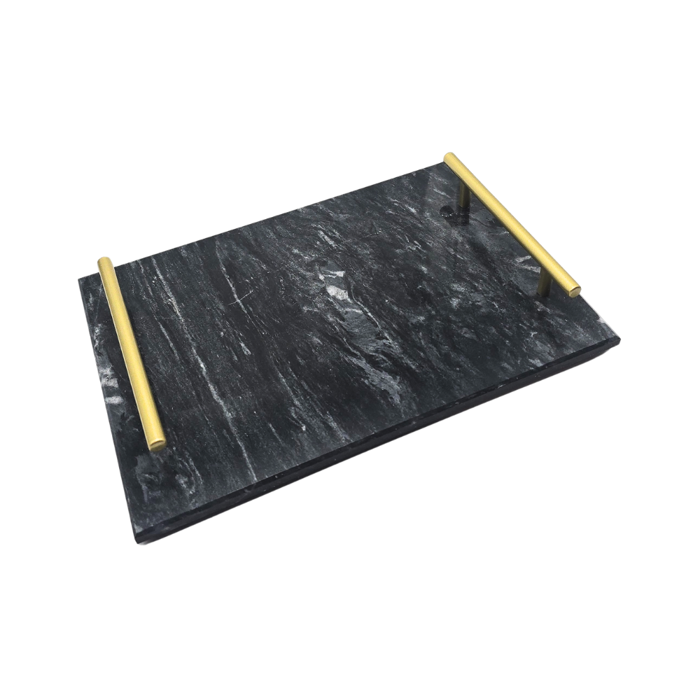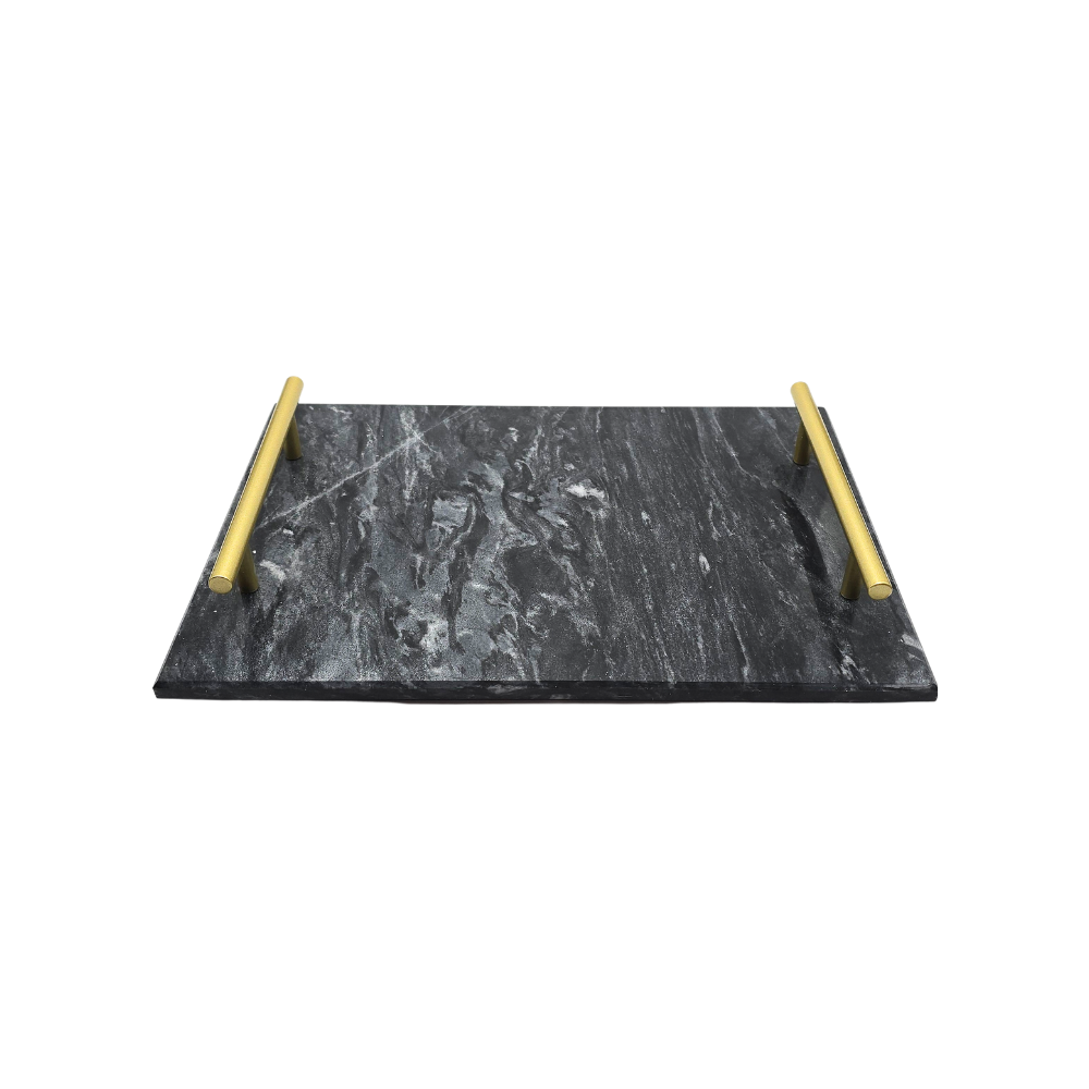 Bandeja em mármore preto com pegadores em metal dourado