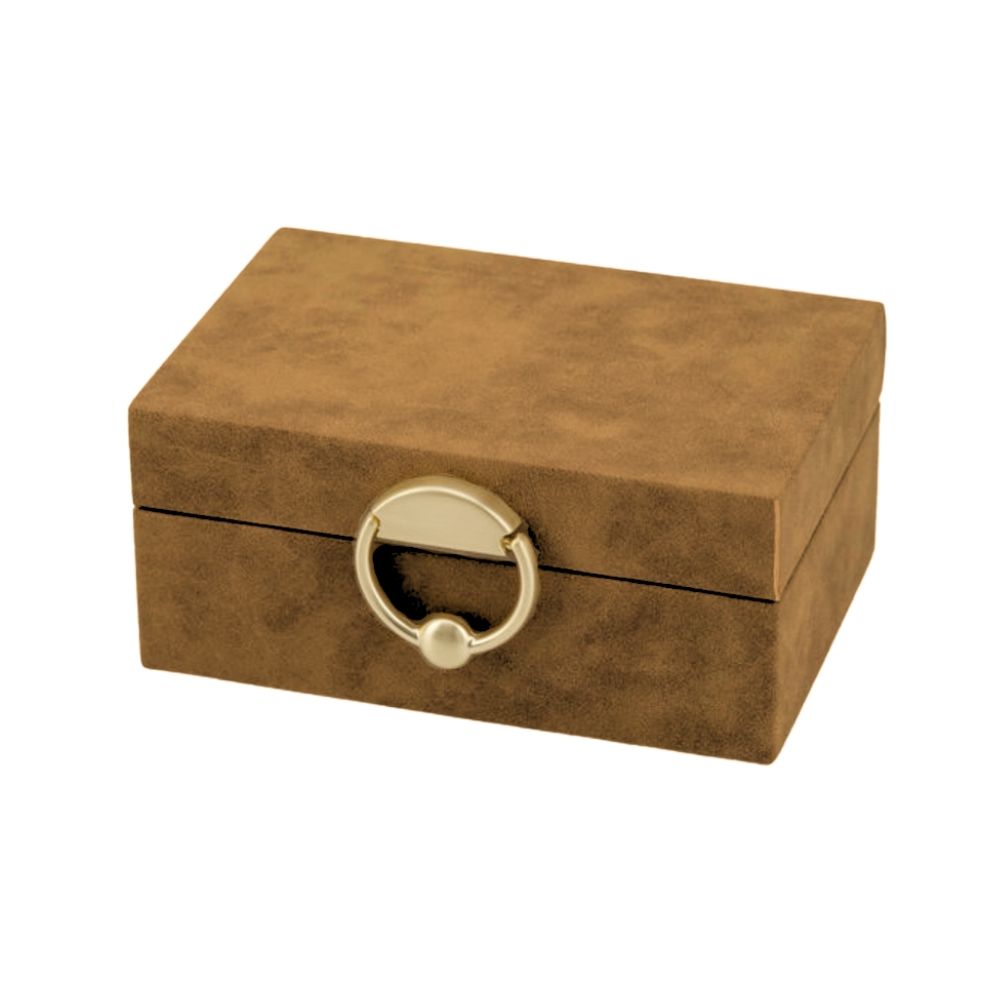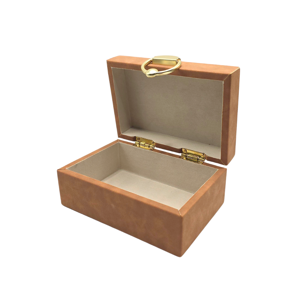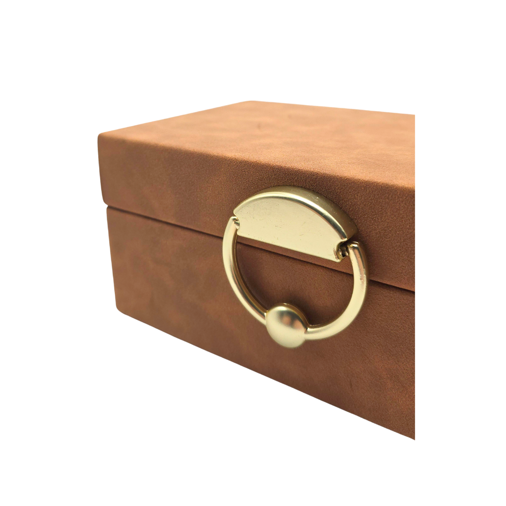 Caixa decorativa com base em MDF, recoberta em aveludado terracota estonado e fechamento em metal dourado
