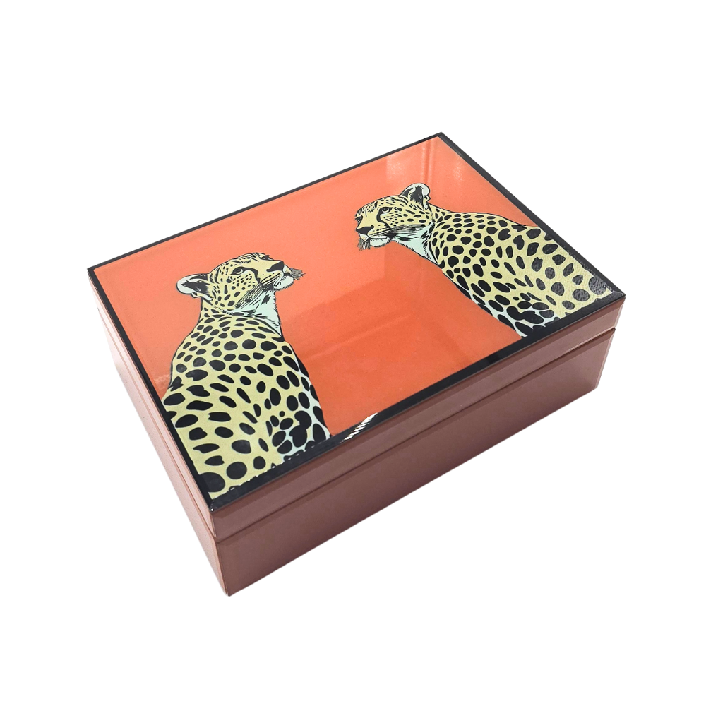 Caixa decorativa com base em MDF e recoberta em vidro laranja com estampa de onças