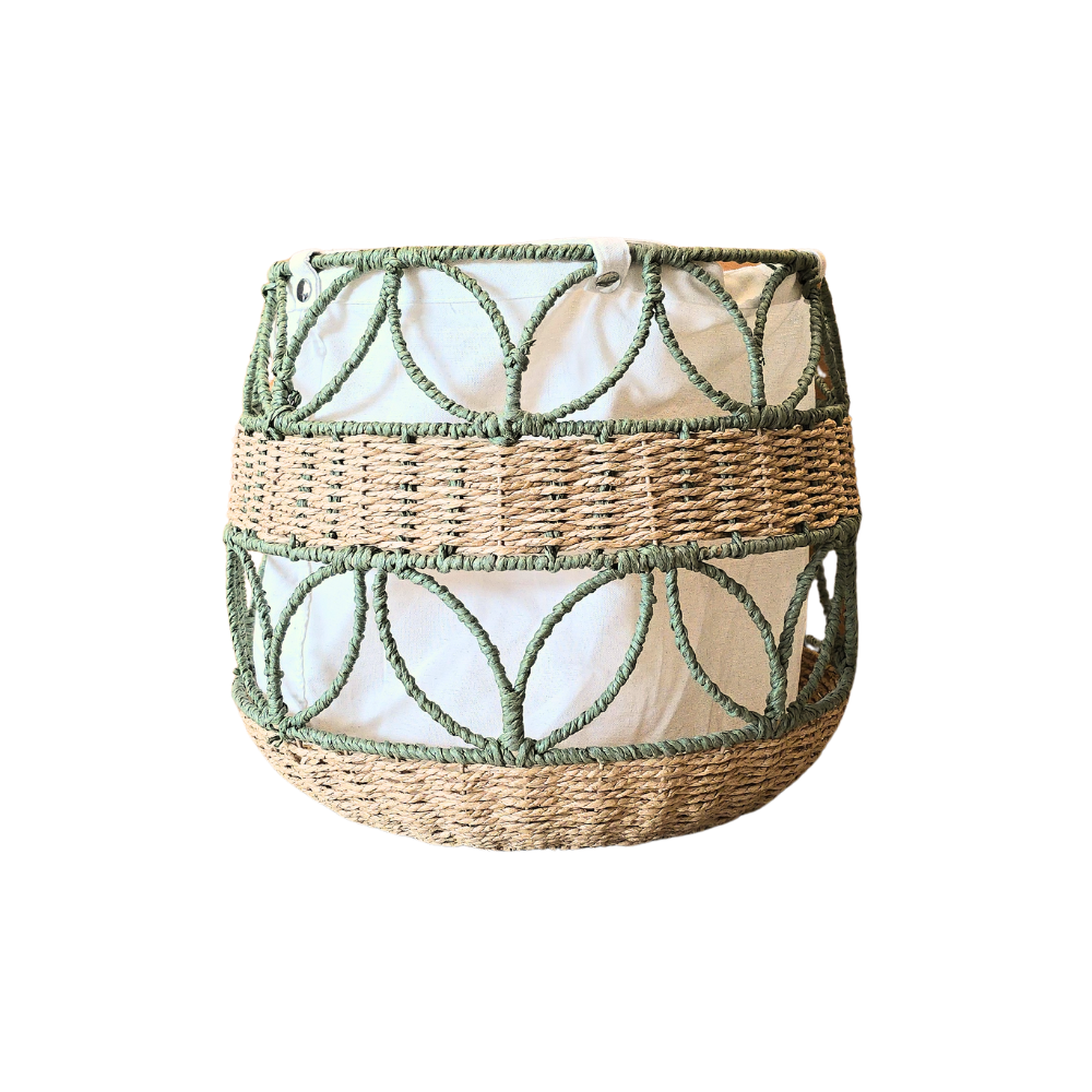 Cesto em corda de papel trançado e tingido de verde sálvia e natural. Acompanha forro de algodão