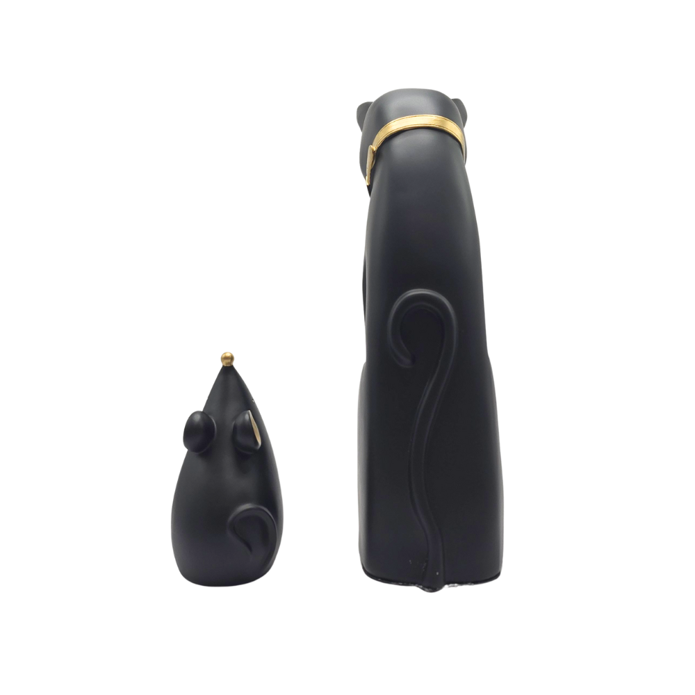 Escultura de gato e rato em poliresina com pintura preta e decoração dourada.