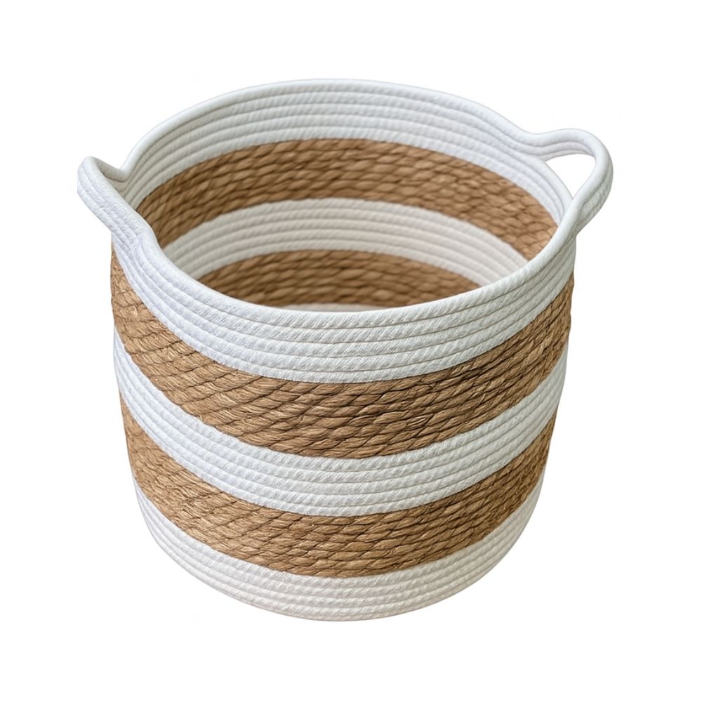 Kit com 3 cestos feitos em algodão cor branca e fibra natural (junco)