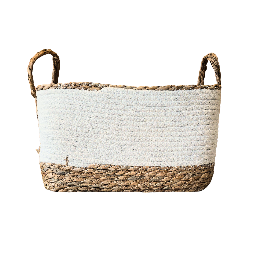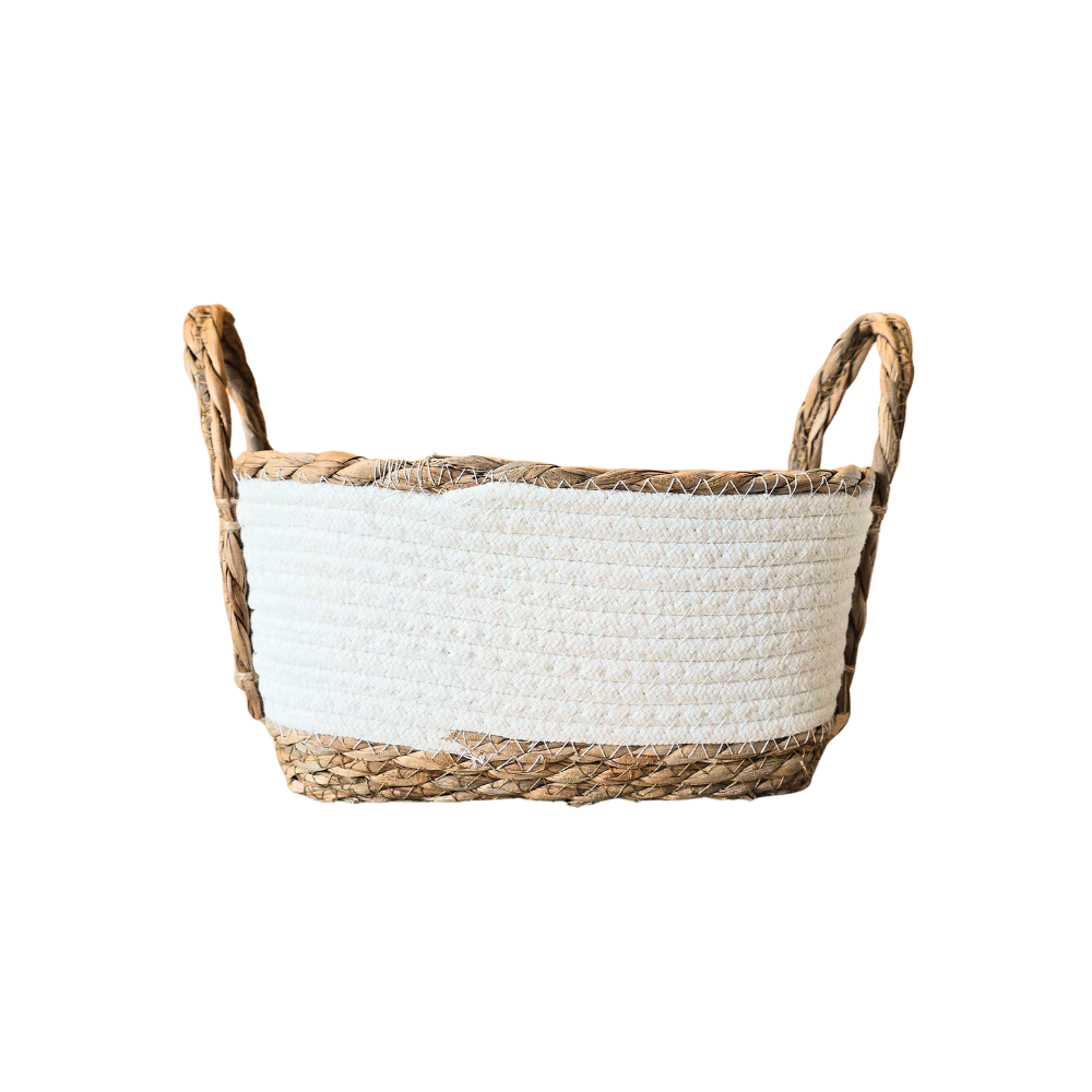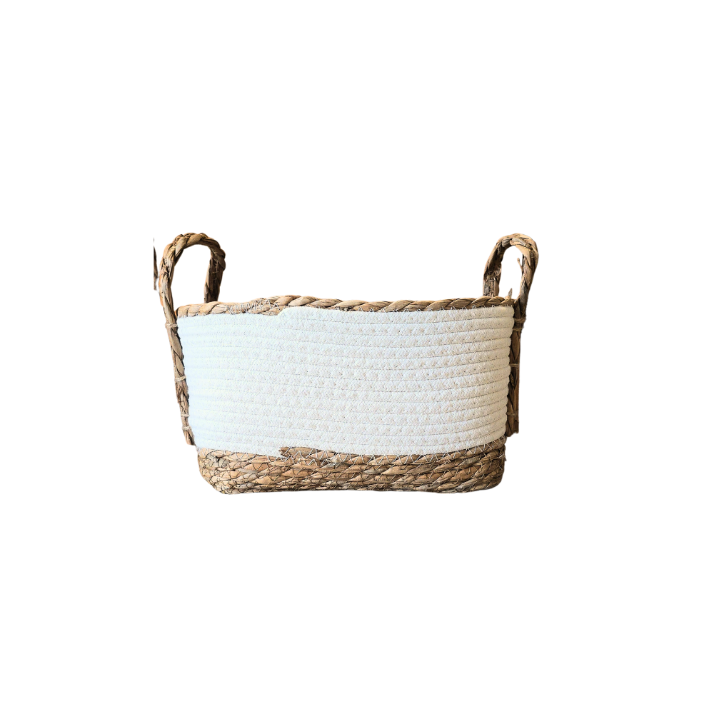 Kit com 3 cestos feitos em algodão cor branca e fibra natural (junco)