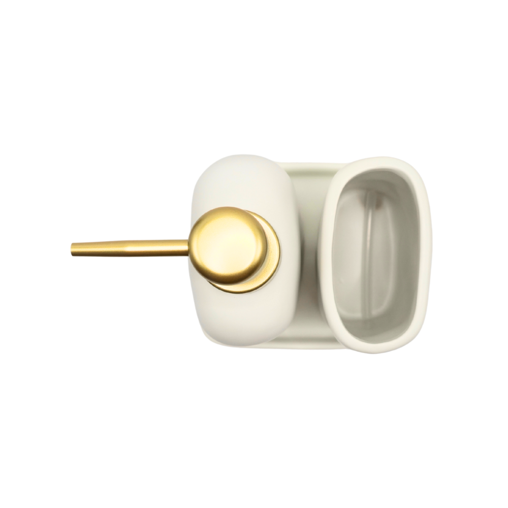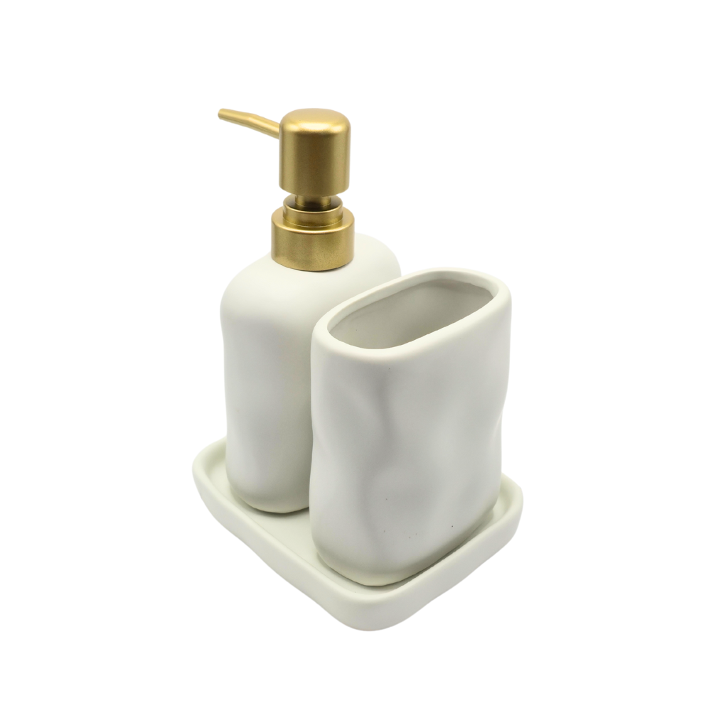 Conjunto para banheiro em cerâmica com 3 peças na cor bege claro com pump para sabonete líquido na cor dourado