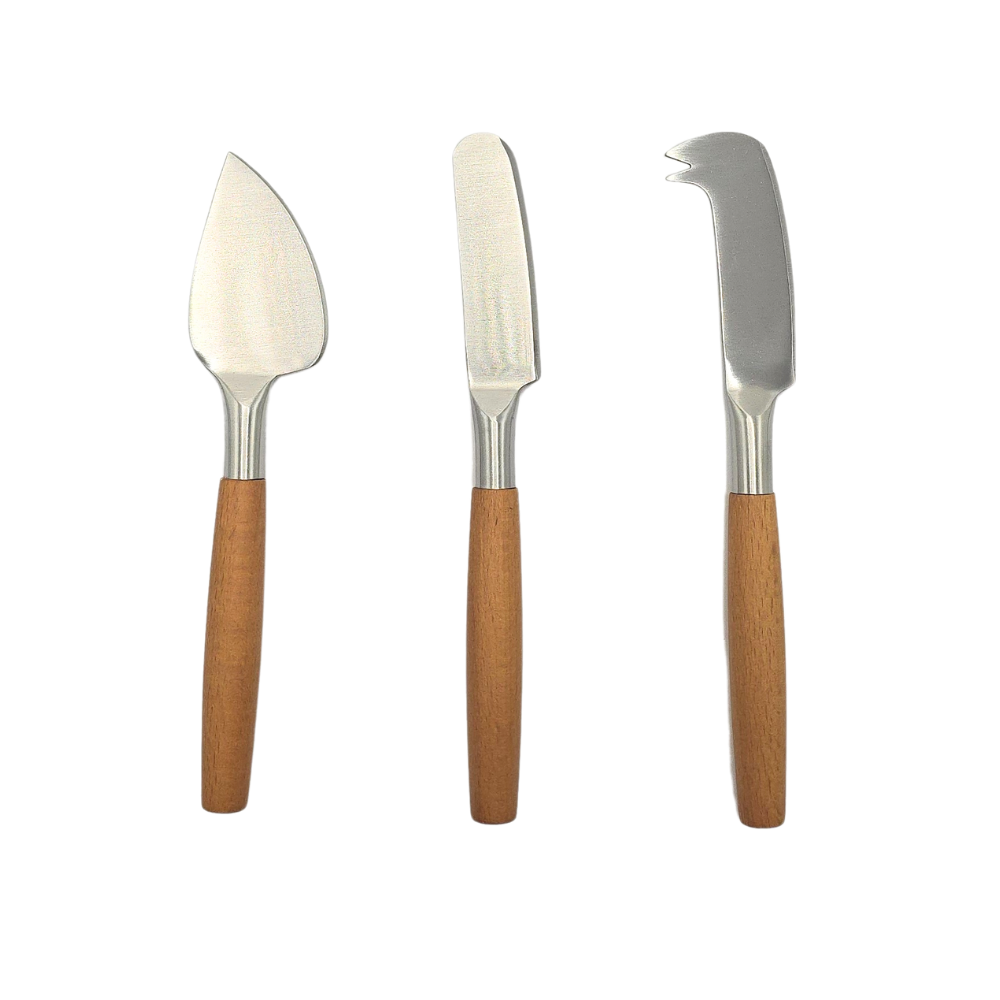 Kit com 3 talheres de queijo em aço inox e haste de madeira maciça acácia