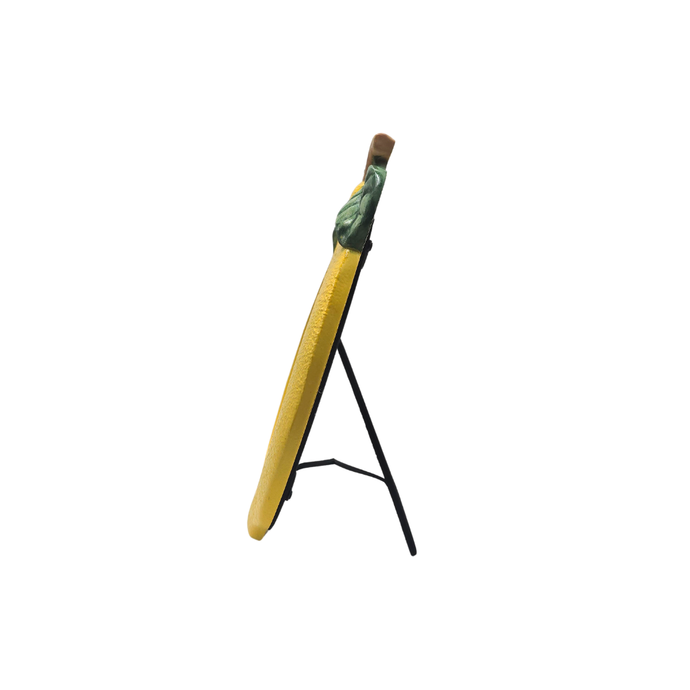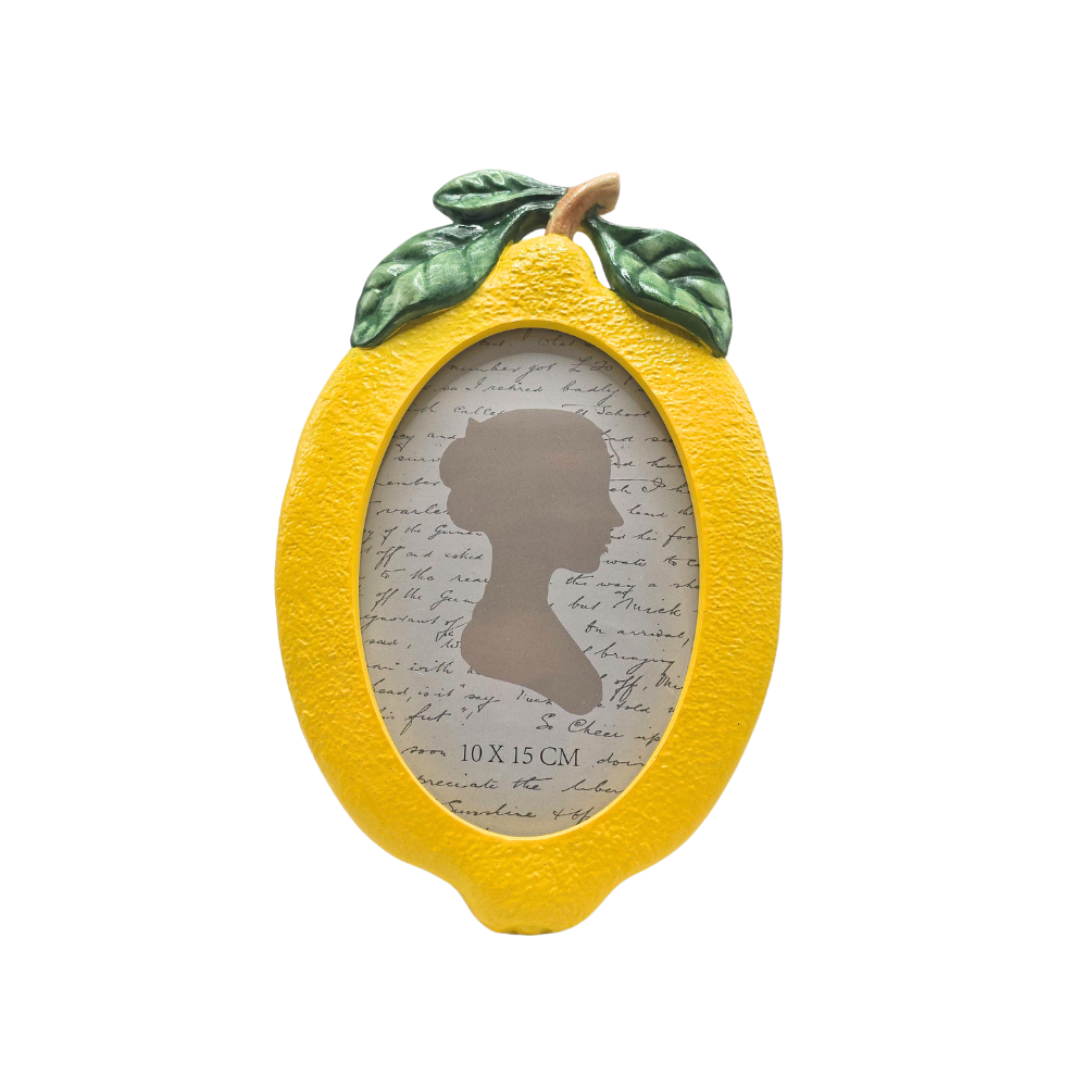 Porta retrato para foto 10x15cm feito em poliresina em formato de limão siciliano amarelo com folhagem verde