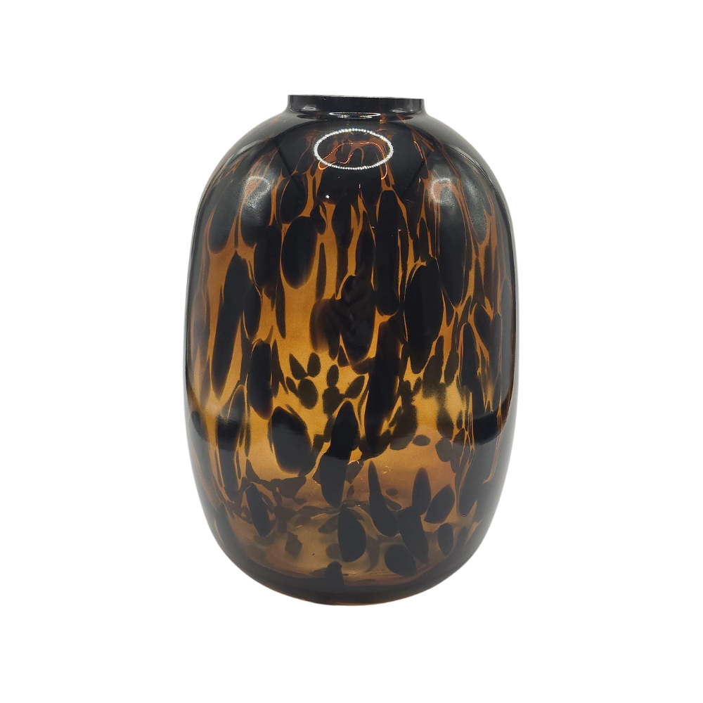 Vaso em vidro pintado em ocre com manchas pretas, estilo tartaruga